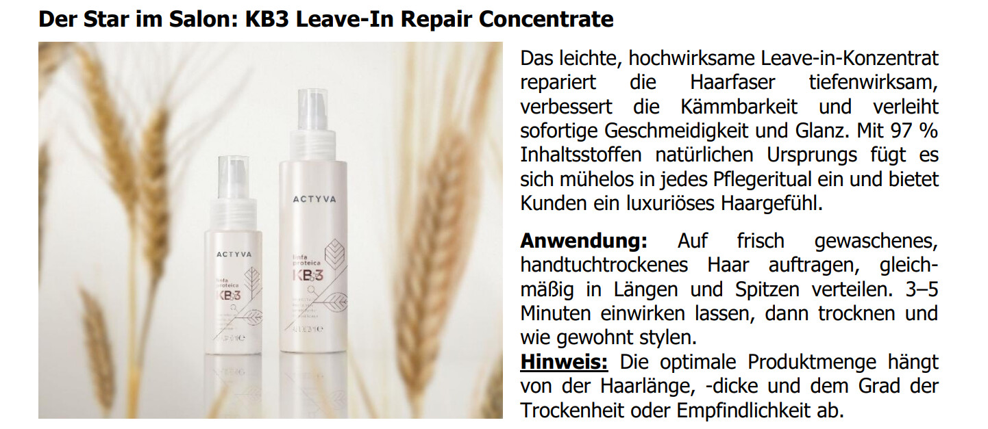 GRÖSSE: 50 ml (UVP 54,95€) // 125 ml (UVP 109,45) Actyva KB3 ist mehr als eine Pflege – es ist die neue Sprache der Haarregeneration.