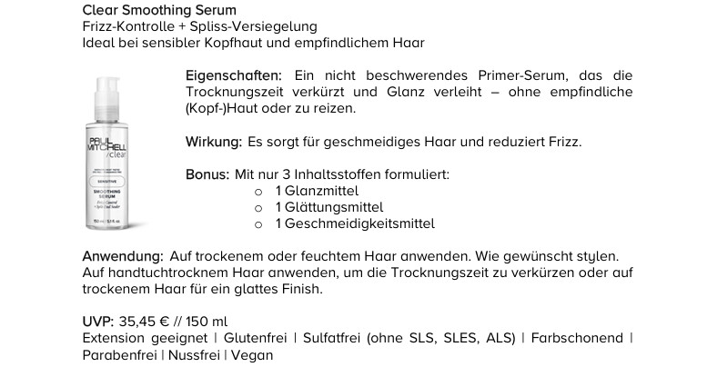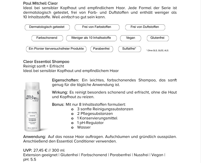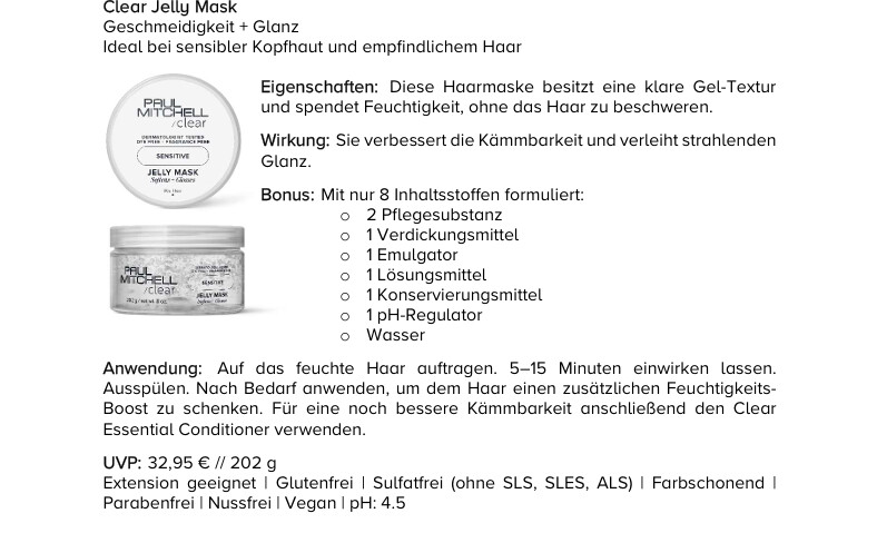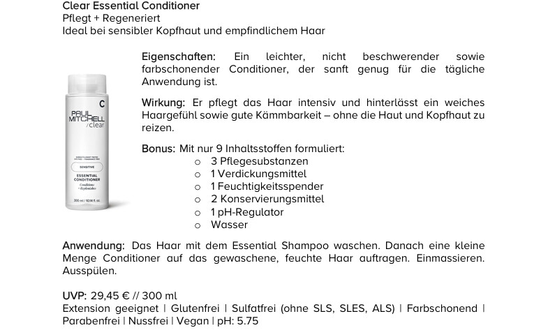 Man sieht sie nicht, doch man spürt ihre Wirkung: Paul Mitchell Clear verzichtet auf alles Überflüssige und konzentriert sich auf das Wesentliche. Entwickelt für empfindliche Kopfhaut, kombinieren die Produkte sanfte Formulierungen mit sichtbaren Ergebnissen. Weniger ist mehr: Nicht mal zehn ausgewählte Inhaltsstoffe sorgen in den Clear-Produkten für Geschmeidigkeit und gesundes Haar, ohne Irritationen zu hinterlassen. Dermatologische Tests bestätigen die hohe Verträglichkeit. Keine Farbstoffe, keine Duftstoffe – ein klares Konzept, sichtbar im Regal und erlebbar unter der Dusche.